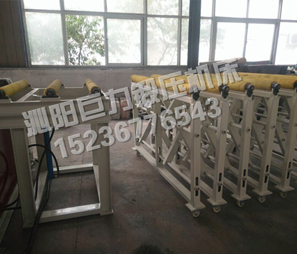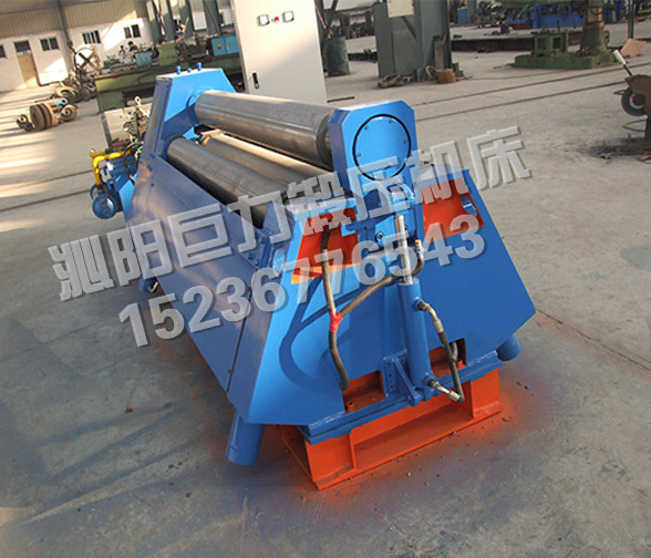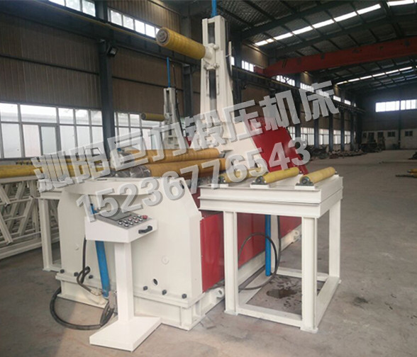 該四輥卷板機與對稱三輥卷板機比較,它可以不借助其它設備模具,直接予彎板材端部,而且剩余直邊較小;它可以不使板材調頭,而卷成工件。