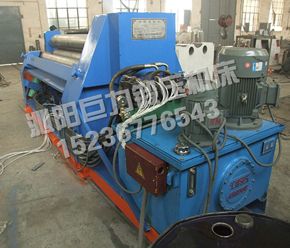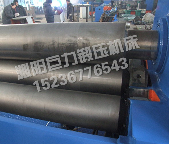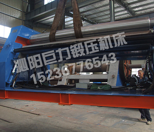 該四輥卷板機與對稱三輥卷板機比較,它可以不借助其它設備模具,直接予彎板材端部,而且剩余直邊較小;它可以不使板材調頭,而卷成工件。