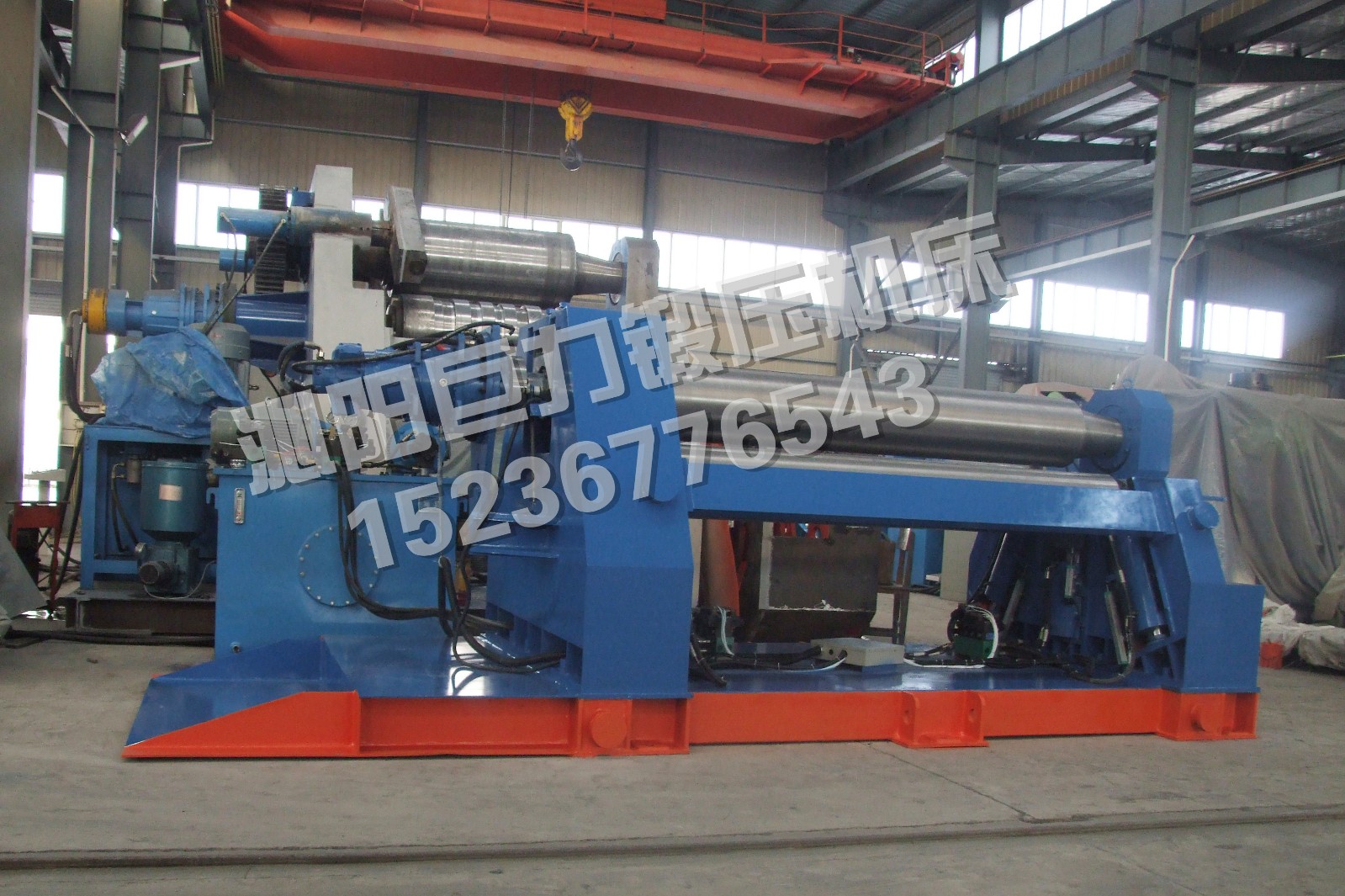 該四輥卷板機與對稱三輥卷板機比較,它可以不借助其它設備模具,直接予彎板材端部,而且剩余直邊較小;它可以不使板材調頭,而卷成工件。