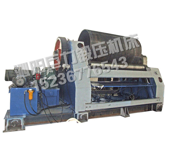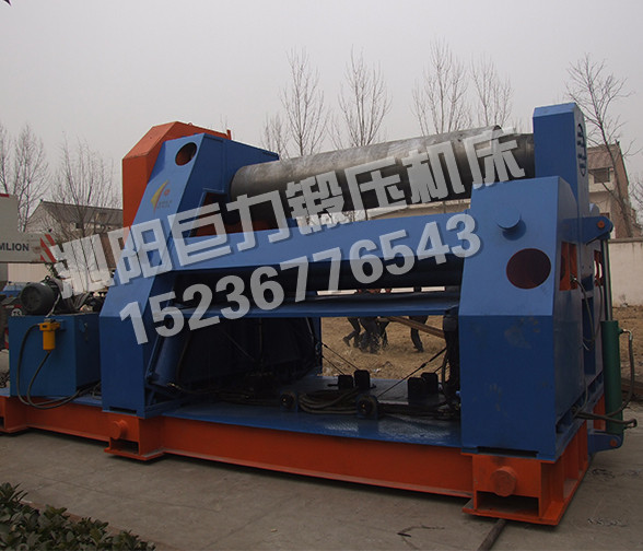 該四輥卷板機與對稱三輥卷板機比較,它可以不借助其它設備模具,直接予彎板材端部,而且剩余直邊較小;它可以不使板材調頭,而卷成工件。